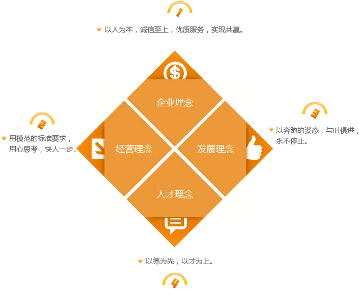 回報(bào)社會(huì)、構(gòu)筑和諧。服務(wù)人民大眾,振興民族經(jīng)濟(jì);質(zhì)量是企業(yè)的生命;顧客是完美的衣食父母;遵守國(guó)家法律,弘揚(yáng)法制精神,伸張社會(huì)正義,爭(zhēng)做守法公民;爭(zhēng)創(chuàng)效益,回報(bào)社會(huì);以人為本,以才興企,廣納賢才。